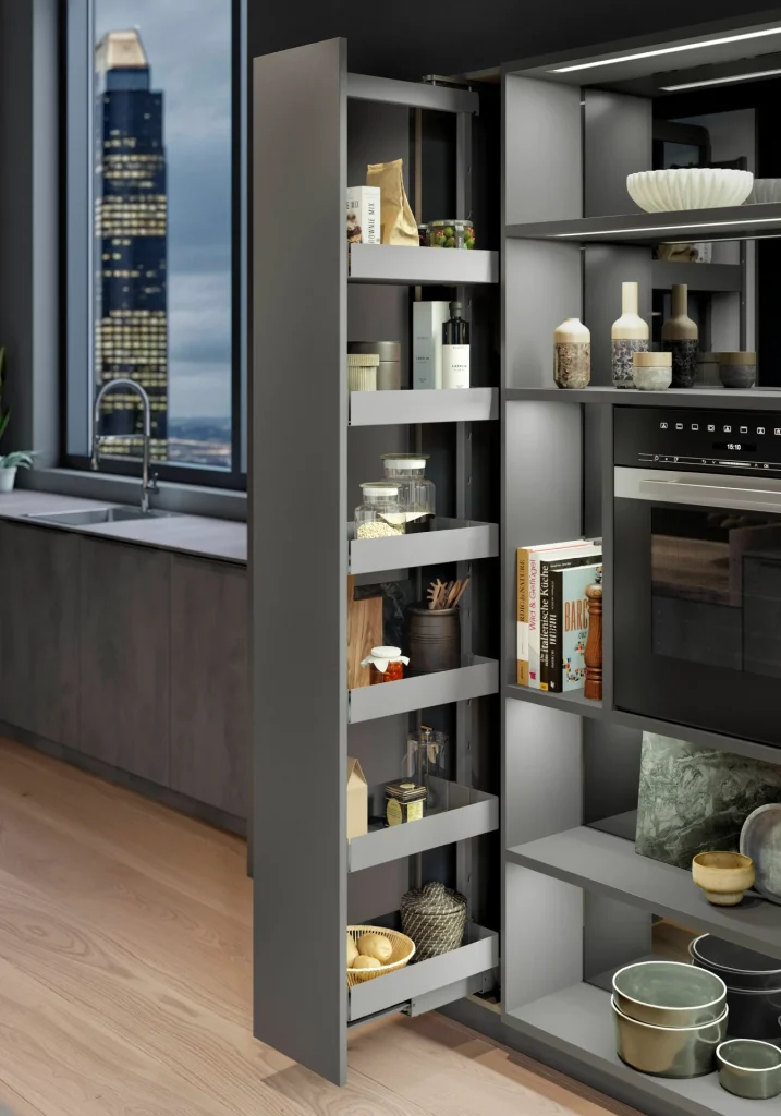Sistemele Jolly sunt extrem de versatile și pot fi integrate în numeroase zone ale bucătăriei, în special acolo unde spațiul este îngust sau greu de utilizat eficient în caz de extractie totala. O opțiune frecventă este montarea lor în partea de jos a mobilierului, într-un corp îngust aflat între două electrocasnice, transformând un spațiu aparent inutil într-un loc practic de depozitare.